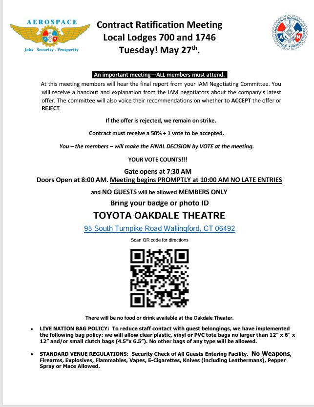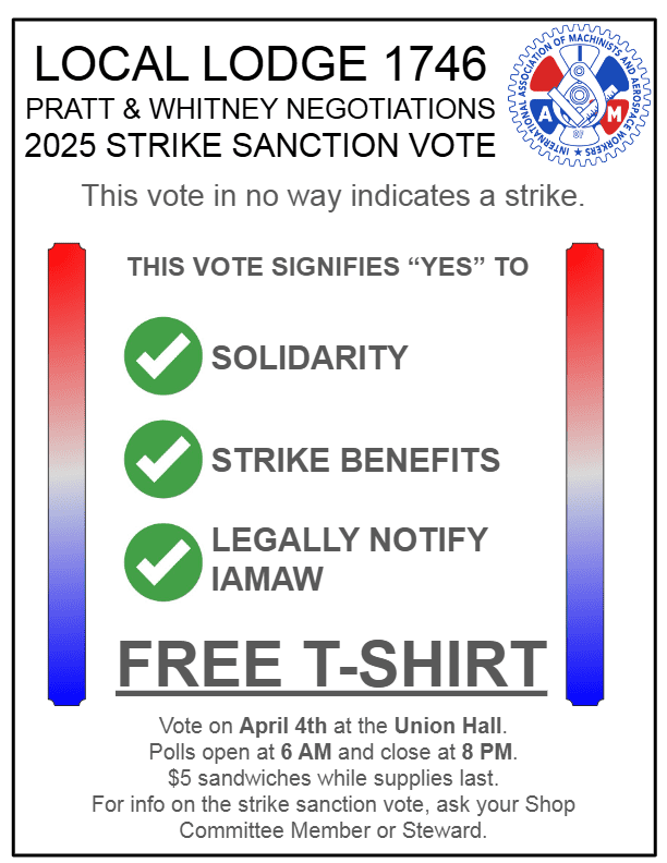 The Collective Bargaining Agreement between IAM Local Lodge 1746 and Local Lodge 700 has been Ratified by a 74% yes vote. We will be returning to work on May 29, 2025. Your supervisor should be contacting you for return-to-work instructions. Thank you to all for staying strong and standing together and to all of the […]